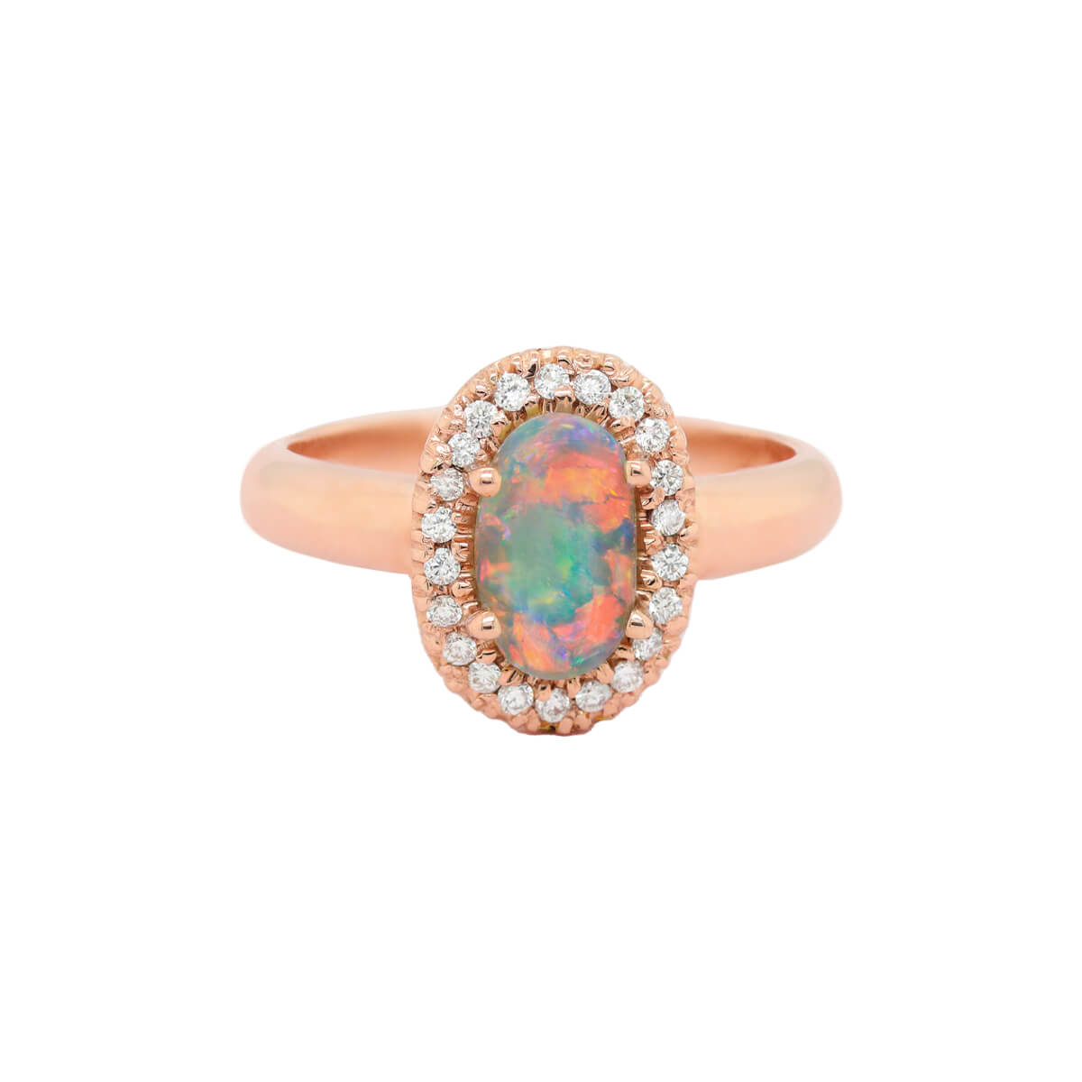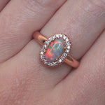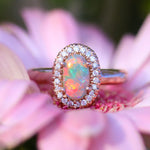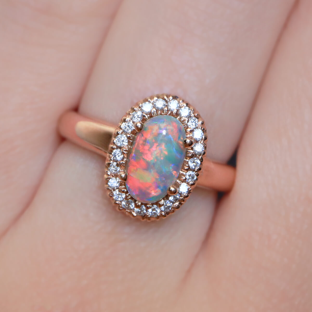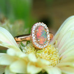Red has represented romance in many cultures around the world for thousands of years. Red is also the rarest color in gemstones, and precious opal is no exception. Red Crystal Opal is highly sought after and very rare. Married to an 18K rose gold ring with a halo of brilliant white diamonds, this ring is nothing short of stunning, representing the rarity of true love and red gems.