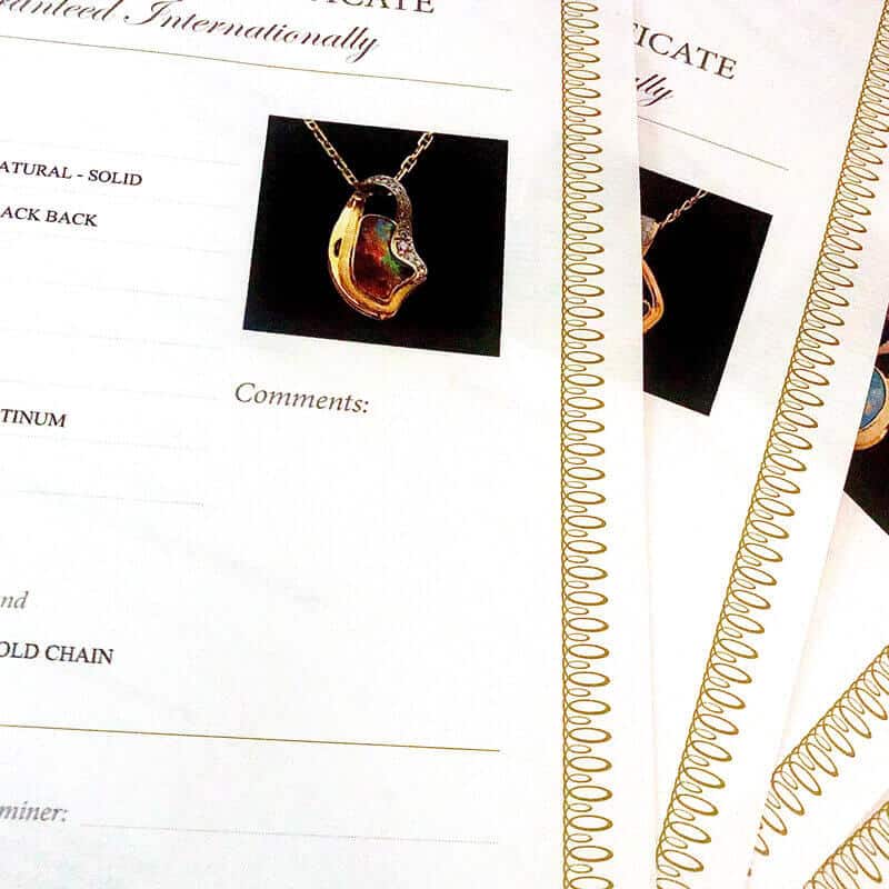 When you purchase a piece of jewellery through Manor Gryffin, you will receive a Certificate of Authenticity which lists the features of the piece, including the opal type, shape, carat weight, dimensions, brightness, as well as metal(s) used and diamond weight and grade, if applicable.